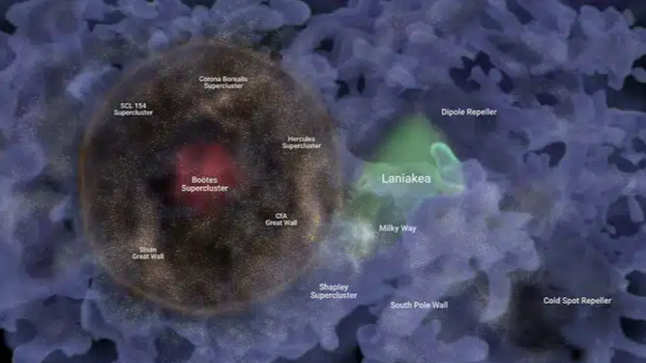 Новая сферическая структура включает огромный войд Волопаса, область диаметром в треть миллиарда световых лет, где звезды так редки, что если бы наша галактика лежала в нем, то мы не узнали бы о существовании иных галактик до появления мощных телескопов в 1960-х годах / © Frédéric Durillon, Animea Studio; Daniel Pomarède, IRFU, CEA University Paris-Saclay